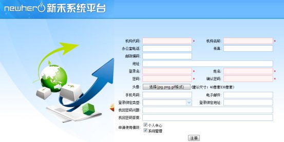 “注册”功能注册新的“机构用户”,适用于云服务环境,方便云用户的注册。注册的“机构用户”不同于“用户管理”中新建的用户,注册用户和注册机构绑定,一一对应。注册机构用户时,同时创建对应的机构,该机构“组织类型”为“单位”,且为系统虚拟根机构“组织机构”下的第一级机构。注册的用户默认为对应机构的管理员。
