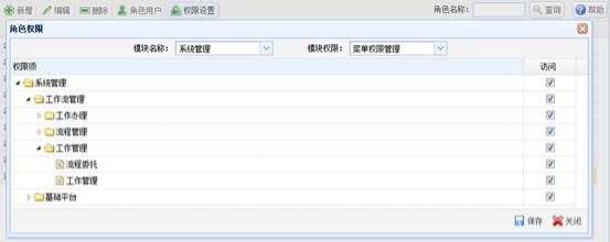 选择一个角色,点击“权限设置”按钮,系统显示“角色权限”页面。选择要分配的模块名称,然后选择要分配的模块权限,以树形的形式展示要分配的权限项。点击权限项名称前的展开按钮,显示此权限项下属权限项。分配权限后,点击“保存”按钮进行保存 。