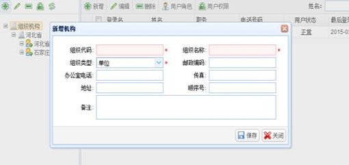在“组织机构树”中选择一个机构节点作为上级机构,点击“组织机构树”上方的“新增”按钮,弹出“新增机构”窗口,输入机构信息,点击“保存”按钮进行保存。