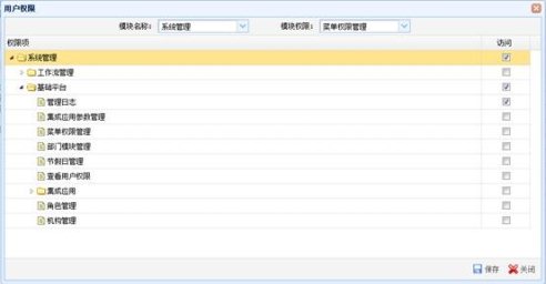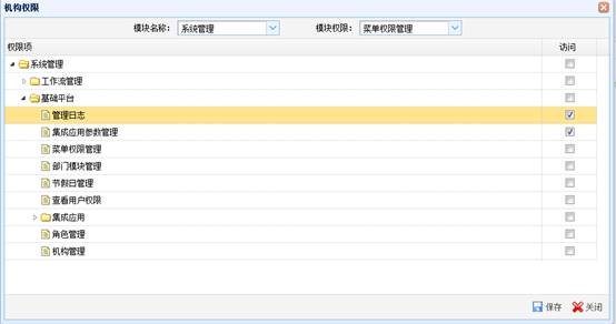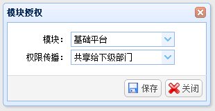 机构“权限设置”是为机构分配各个模块的具体操作权限。选择一个机构,点击“权限设置”按钮,弹出“机构权限”窗口。在“机构权限”窗口中选择要分配的“模块名称”以及“模块权限”后,系统展示选中“模块权限”的“权限项”列表。