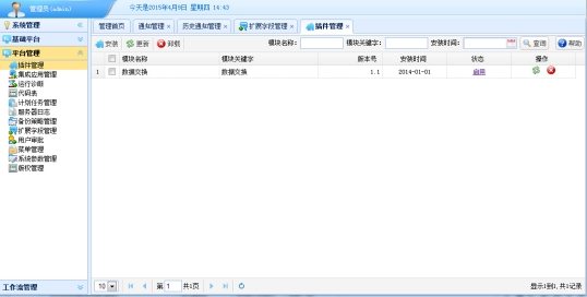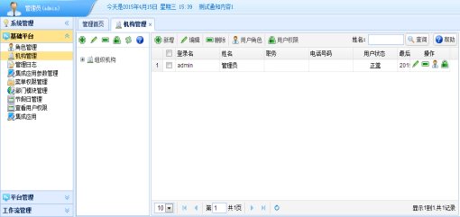 支撑平台包括:机构管理、角色管理、菜单管理、计划任务管理、日志管理、模块管理、运行诊断等功能。