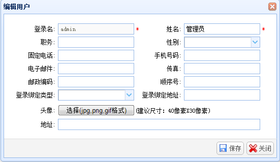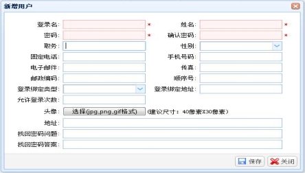 选择一个机构,点击用户列表工具栏“新增”按钮,系统显示“新增用户”窗口,输入用户信息,点击“保存”按钮进行保存。