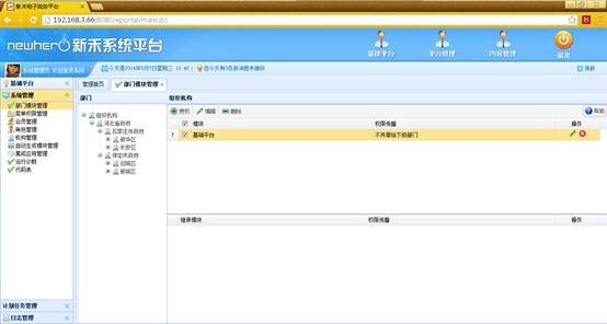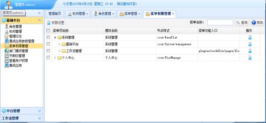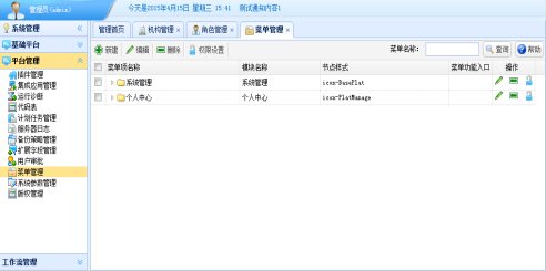 “菜单管理”功能可以新增、编辑、查看菜单详细信息,将菜单的权限分配给单位、部门、角色、用户。