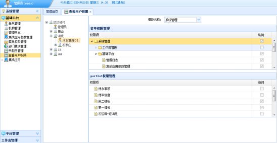 系统采用统一的权限管理机制,不同应用模块可以在系统平台提供的机制内设置自己的权限管理策略,权限设置保存在统一的权限表内,系统提供API接口方便应用开发人员获取系统用户权限。