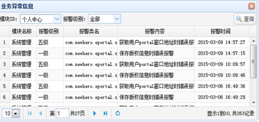 业务异常信息是系统运行过程中,系统记录下的各类业务报警消息,对系统管理人员排除系统异常错误提供有力支持。