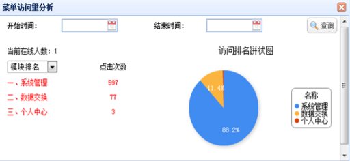 .选择“模块排名”,可以查看各个模块的点击次数汇总的前五名。选择“菜单排名”可以查看各个菜单的点击次数汇总的前五名。