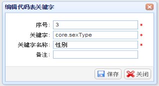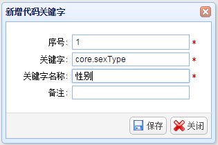 页面左侧是系统“模块”和“代码关键字”树形列表,选中一个模块节点,单击代码关键字“新增”按钮,弹出“新增代码关键字”窗口,输入“序号”、“代码”、“代码值”、“备注”信息,单击“保存”按钮进行保存。