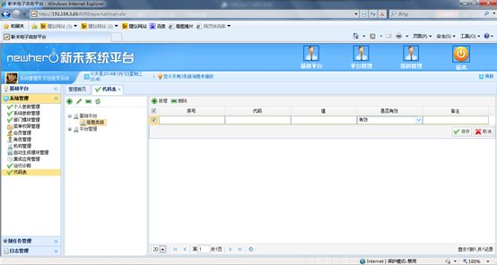 选中要添加代码的关键字,单击页面右侧代码“新增”按钮,页面右侧代码列表中会新增一条空白代码数据,输入“序号”、“代码”、“值”、“备注”、“代码状态”后,单击代码“保存”按钮进行保存。