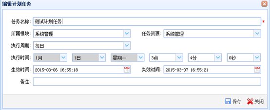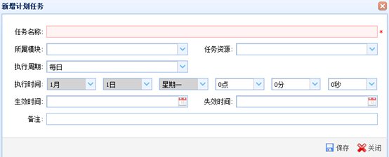 单击“新增”按钮,弹出“新增计划任务”窗口。输入“任务名称”、“备注”、选择“所属模块”、任务资源、“执行周期”、“生效时间”、“失效时间”,单击“保存”按钮进行保存。