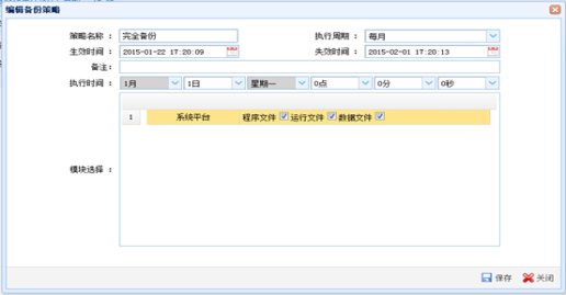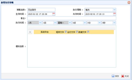 备份策略管理页面单击“新增”按钮,弹出“新增备份策略”窗口。输入备份信息,设置备份规则,单击“保存”按钮完成新增操作。