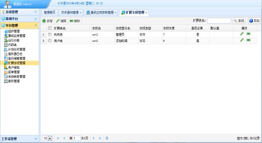 “扩展字段管理”功能是当系统中机构表、用户表、会员表现有字段无法满足用户需求时,对上述3个表可以进行字段扩展,按照用户业务需求添加相应的字段。扩展字段添加后,在对机构、用户、会员管理时,系统按照扩展字段自动扩充机构、用户、会员的基本属性。