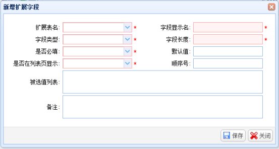点击“新增”按钮,弹出“新增扩展字段信息”窗口,输入扩展字段信息,点击“保存”按钮进行保存。