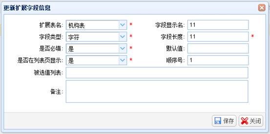 选择需要编辑的扩展字段,点击“编辑”按钮,弹出“更新扩展字段信息”窗口,修改扩展字段信息,点击“保存”按钮进行保存。