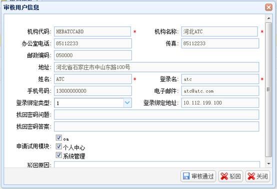 选择用户状态为“待审核”状态的用户,点击“待审核”,弹出“审核用户信息”窗口,管理员查看注册机构用户信息,点击“审核通过”、“驳回”按钮,完成审批。