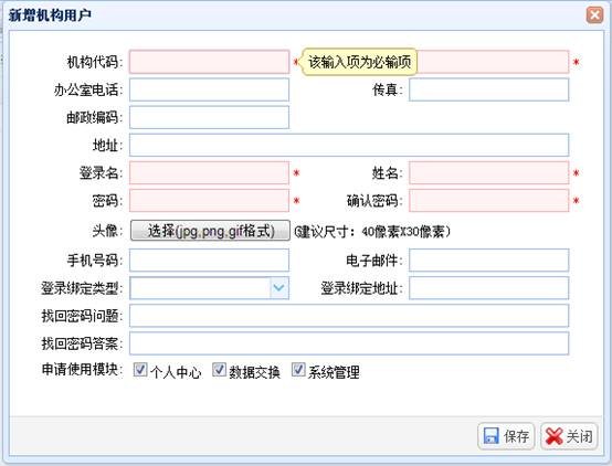 点击“新增”按钮,弹出“新增机构用户”页面,输入机构信息和管理员信息,点击“保存”按钮进行保存。