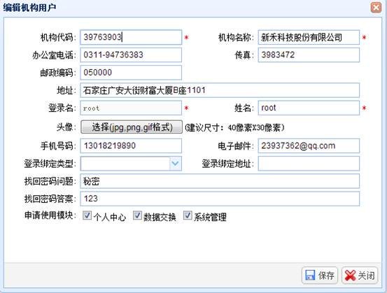 选择一个机构用户,点击“编辑”按钮,系统显示“编辑机构用户”页面,修改机构信息后,点击“保存”按钮进行保存。