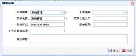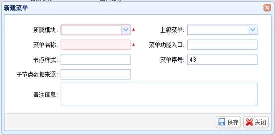 点击“新建”按钮,弹出“新增菜单”窗口,输入菜单信息后,点击“保存”按钮进行保存。