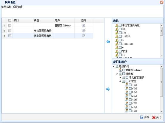 选择一条菜单项,点击“权限设置”按钮,系统显示“权限设置”页面。选择角色、用户、机构后点击“←”左移按钮左侧,会将所选择的角色、用户、机构添加到左侧列表中。选择左侧列表中的一行,点击“→”右移按钮,会将所选的行删除掉。点击“保存”按钮进行保存。