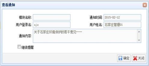 选择一条通知,点击“查看”按钮,系统弹出“查看通知”窗口,点击“确定”按钮,已查看过的通知,成为历史通知,系统首页上不再进行提醒。勾选“继续提醒”复选框,已查看过的通知,不会成为历史通知,系统首页上继续提醒。
