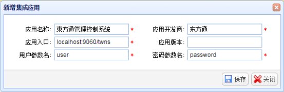 点击“新增”按钮,弹出“新增集成应用信息”窗口,输入集成应用信息,点击“保存”按钮进行保存。
