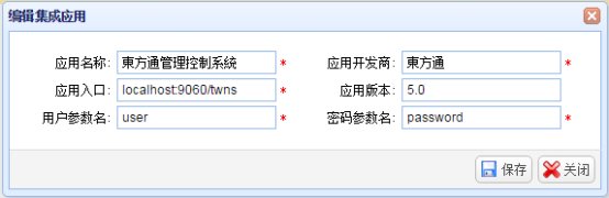 选择需要编辑的应用,点击列表顶端“编辑”按钮,弹出“编辑集成应用信息”窗口,修改集成应用信息后,点击“保存”按钮进行保存。