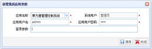 点击“新增”按钮,弹出“新增集成应用参数信息”窗口,输入集成应用参数信息,点击“保存”按钮进行保存。