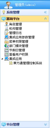 在“集成应用管理”中定义好第三方WEB应用的入口地址、应用名称等基本信息。在“集成应用参数管理”中配置应用系统的用户和平台用户的映射关系,并设定应用系统的用户密码。然后通过“角色管理”的“权限设置”可以授权某个角色对平台集成的第三方应用访问。